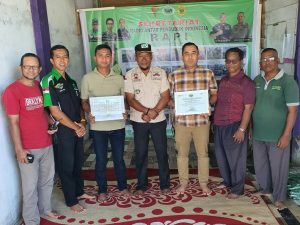 Ketua RAPI Nagan Raya, Agus Salim, Rz.S.Sos, /JZ 01 AGE menyerahkan sertifikat penghargaan kepada Camat Seunagan Timur Said Mudhar, M.Pd, M.M, Kapolsek Seunagan Timur IPDA Mursal, S.IP, S.Sos, serta Danramil Seunagan Timur Lettu Inf Sutiyar.